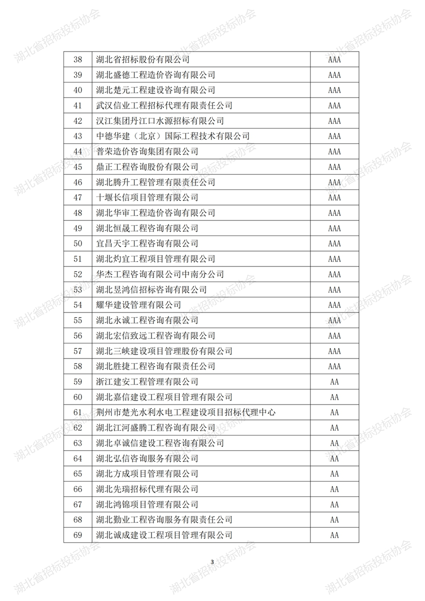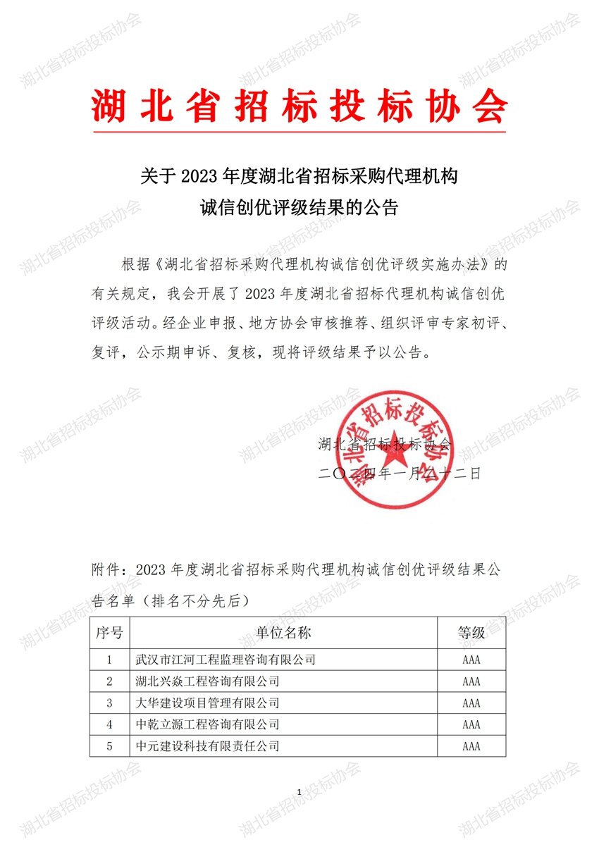 根據《湖北省招標采購代理機構誠信創(chuàng)優(yōu)評級實施辦法》的有關規(guī)定,我會開展了2023年度湖北省招標代理機構誠信創(chuàng)優(yōu)評級活動。經企業(yè)申報、地方協(xié)會審核推薦、組織評審專家初評、復評,公示期申訴、復核,現(xiàn)將評級結果予以公告。