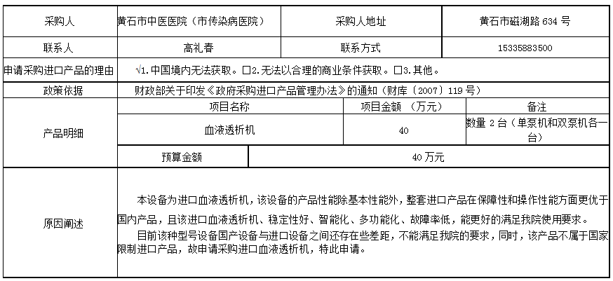 根據(jù) 黃石市中醫(yī)醫(yī)院(市傳染病醫(yī)院)血液透析機采購項目 的需要,擬采購進口設(shè)備,預(yù)算金額為40萬元,數(shù)量2臺(單泵機和雙泵機各一臺),F(xiàn)將申請采購進口產(chǎn)品的專家論證意見進行公示,公示期為五個工作日。若在公示期間對專家組論證意見持有異議,請用書面方式將相關(guān)意見和依據(jù)報送采購單位。